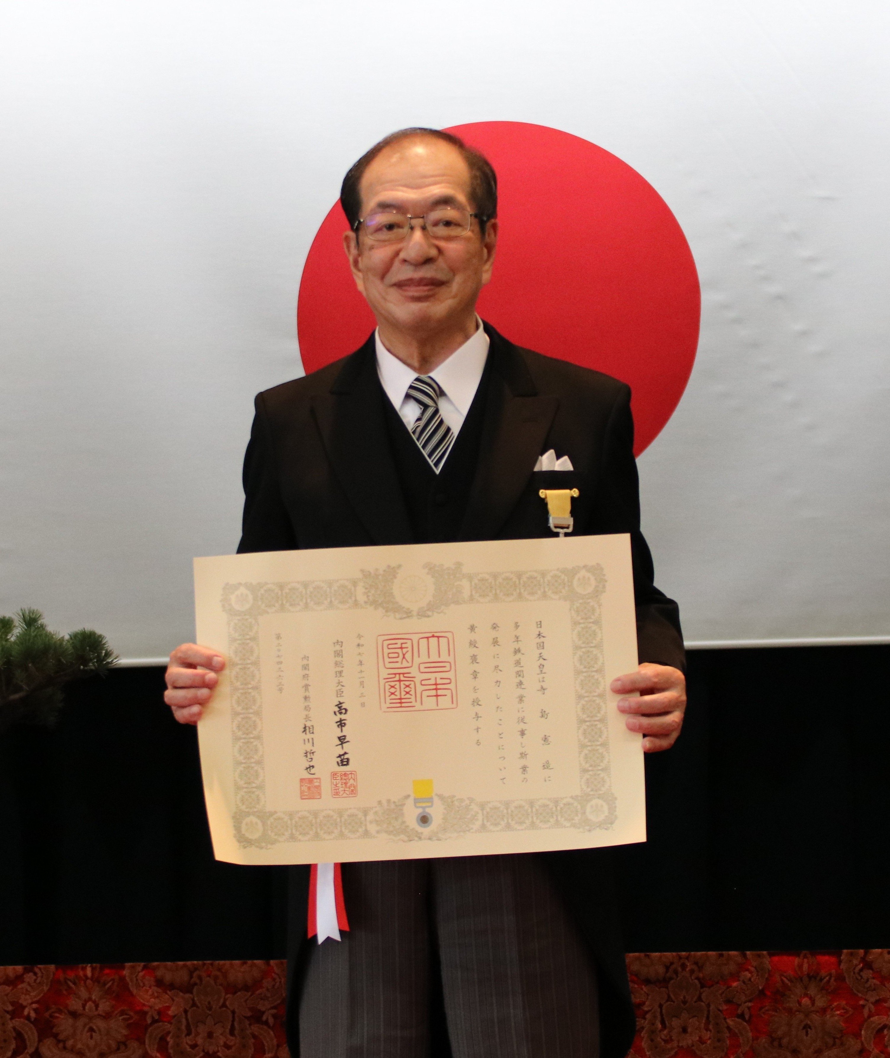 当社の取締役会長 寺島 憲造(てらしま けんぞう)が、令和7年秋の褒章「黄綬褒章」を受章いたしましたことをお知らせします。黄綬褒章は、農業、商業、工業等の分野において、その道一筋に業務に精励し衆民の模範となる方を対象に授与されるものです。この度の受章は、鉄道事業全体の発展に大きく貢献したことが評価されました。