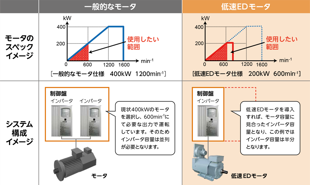 従来の定格回転速度の1/2の低速シリーズをラインナップ。