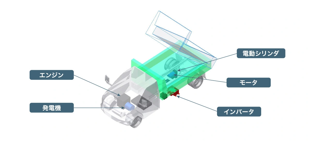 トラックの荷台を傾ける電動シリンダに適用した例です。
