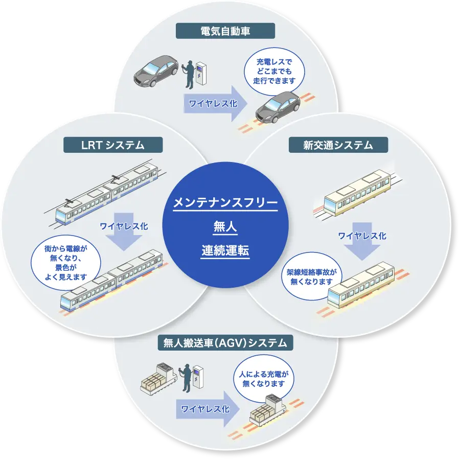 東京大学新領域創成科学研究科藤本教授らグループとの共同研究において、世界で初めて道路に敷設したコイルからインホイールモータへの走行中給電による実車走行 で培った 技術(※1)を活用し、鉄道や船舶をはじめとした移動体や産業機器への製品を開発しています。