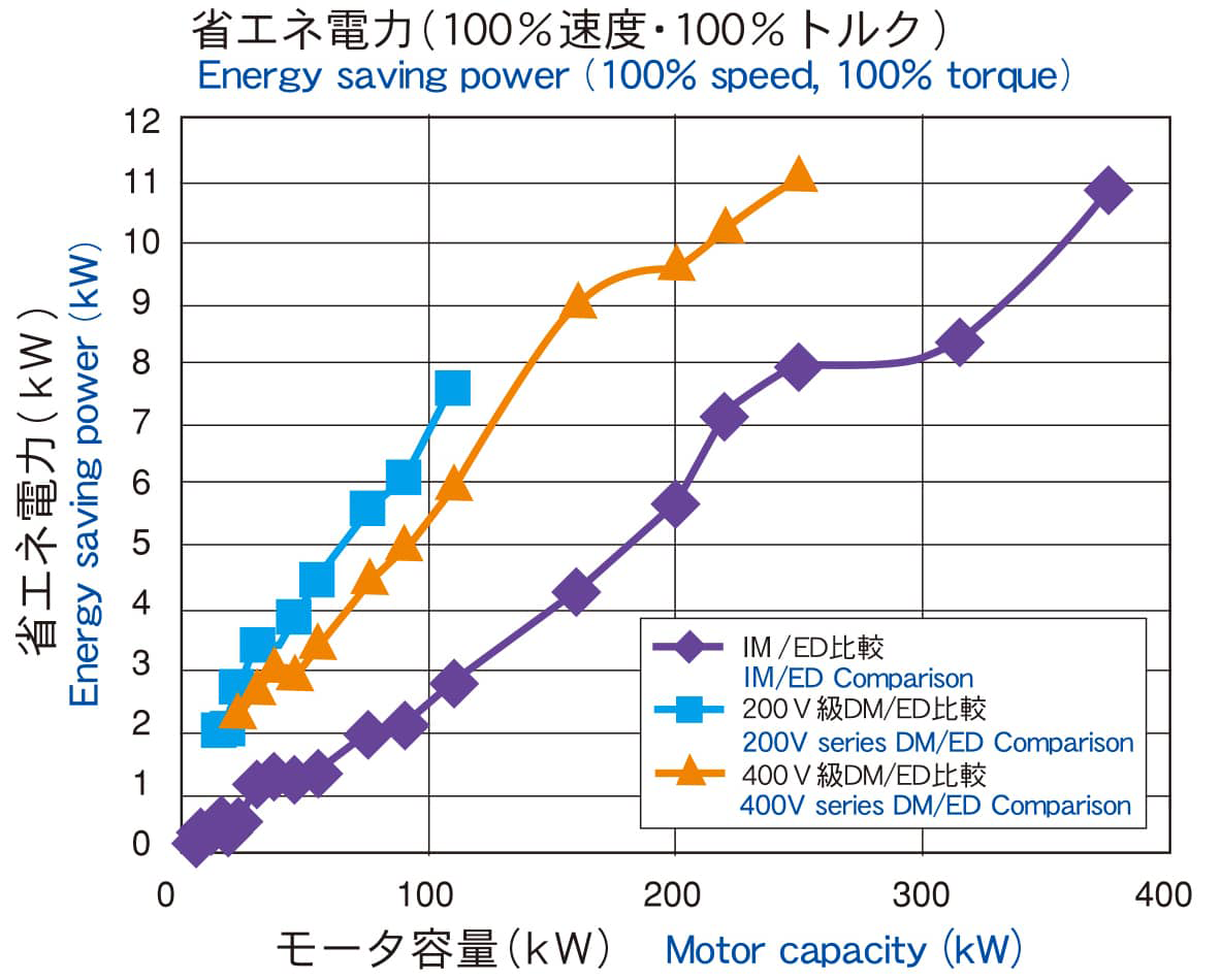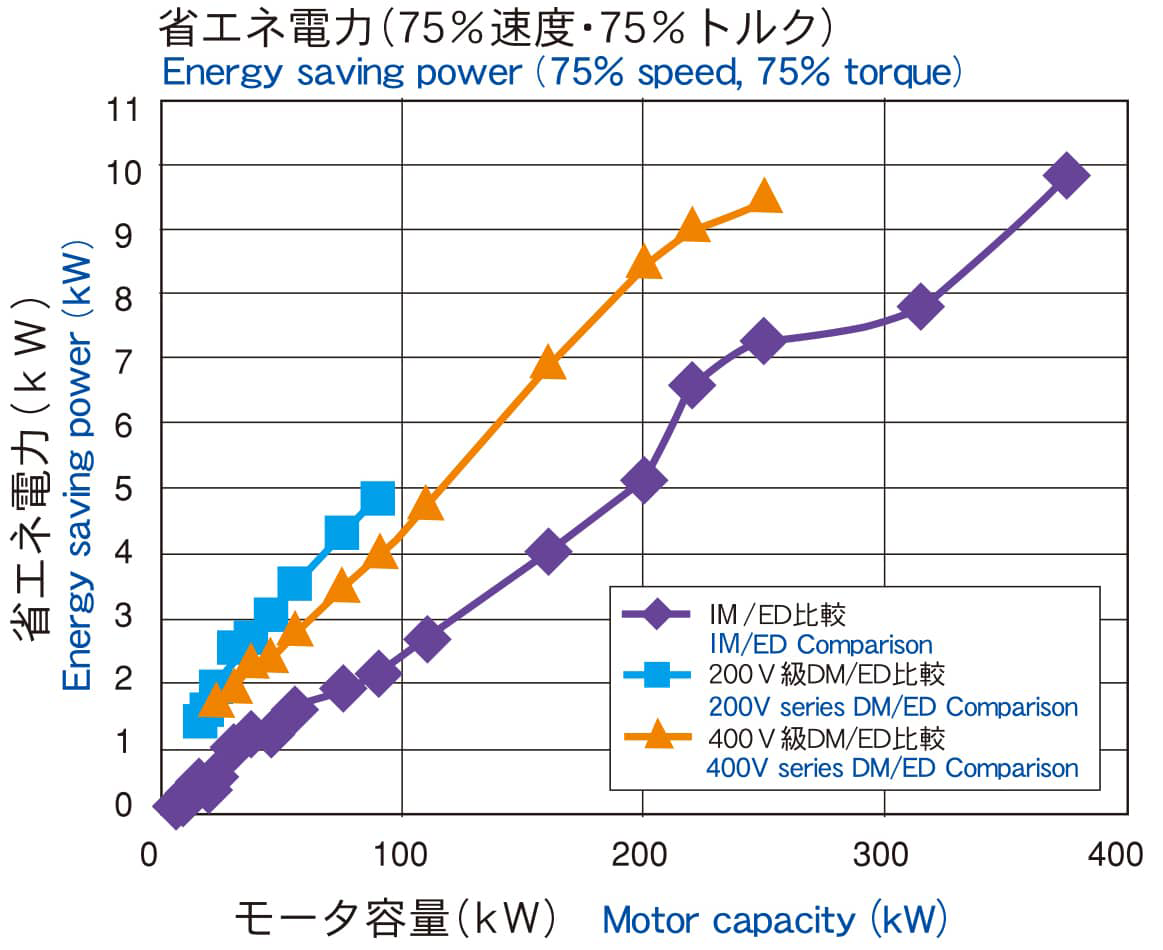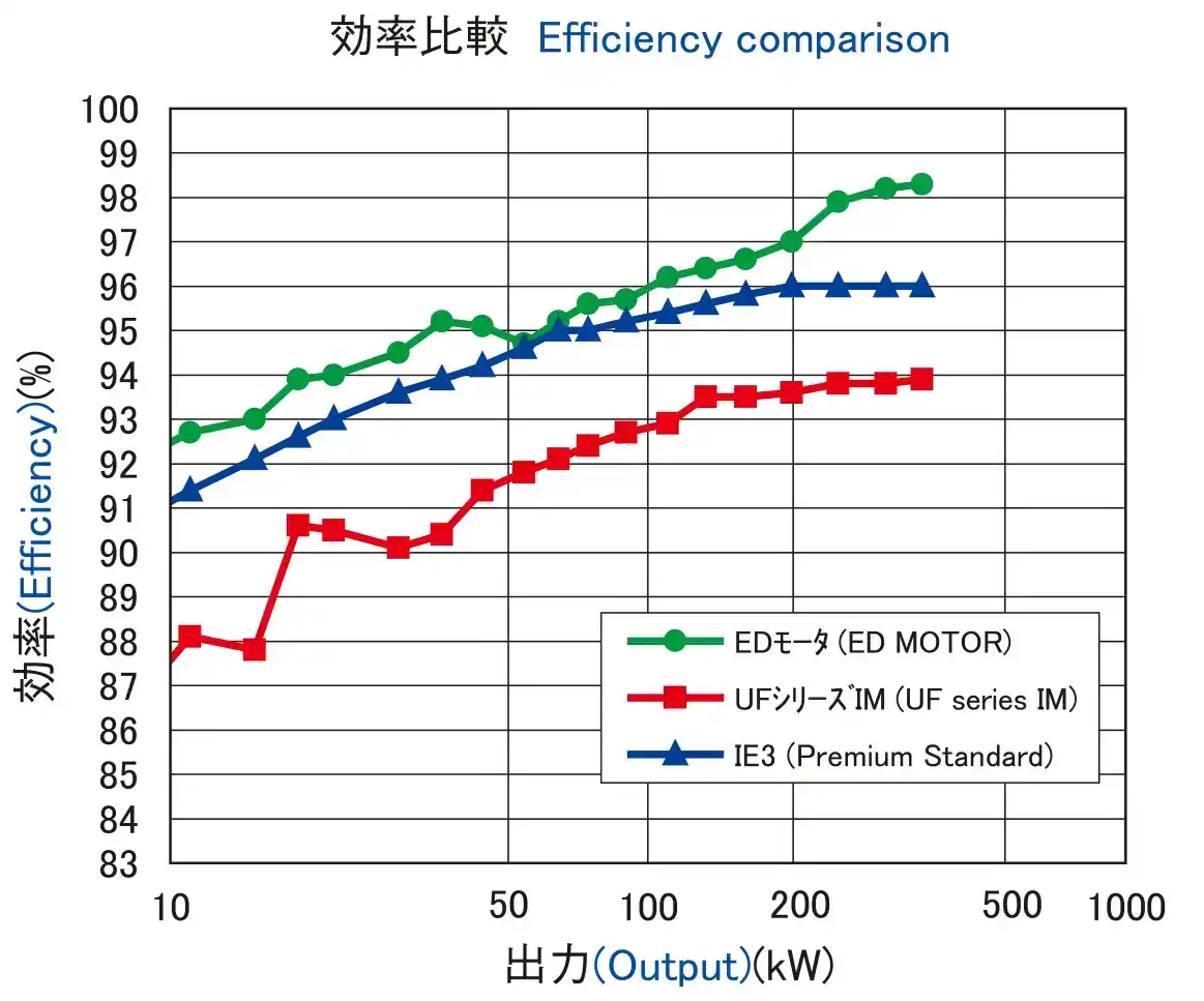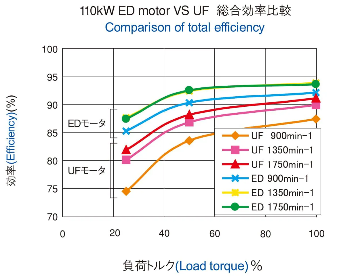 EDモータ単体での効率は、IE3プレミアム効率規格値に対して2%前後、インバータ専用誘導電動機(以下UFシリーズインバータ専用IM)に対して約5%前後効率UPを実現しています。