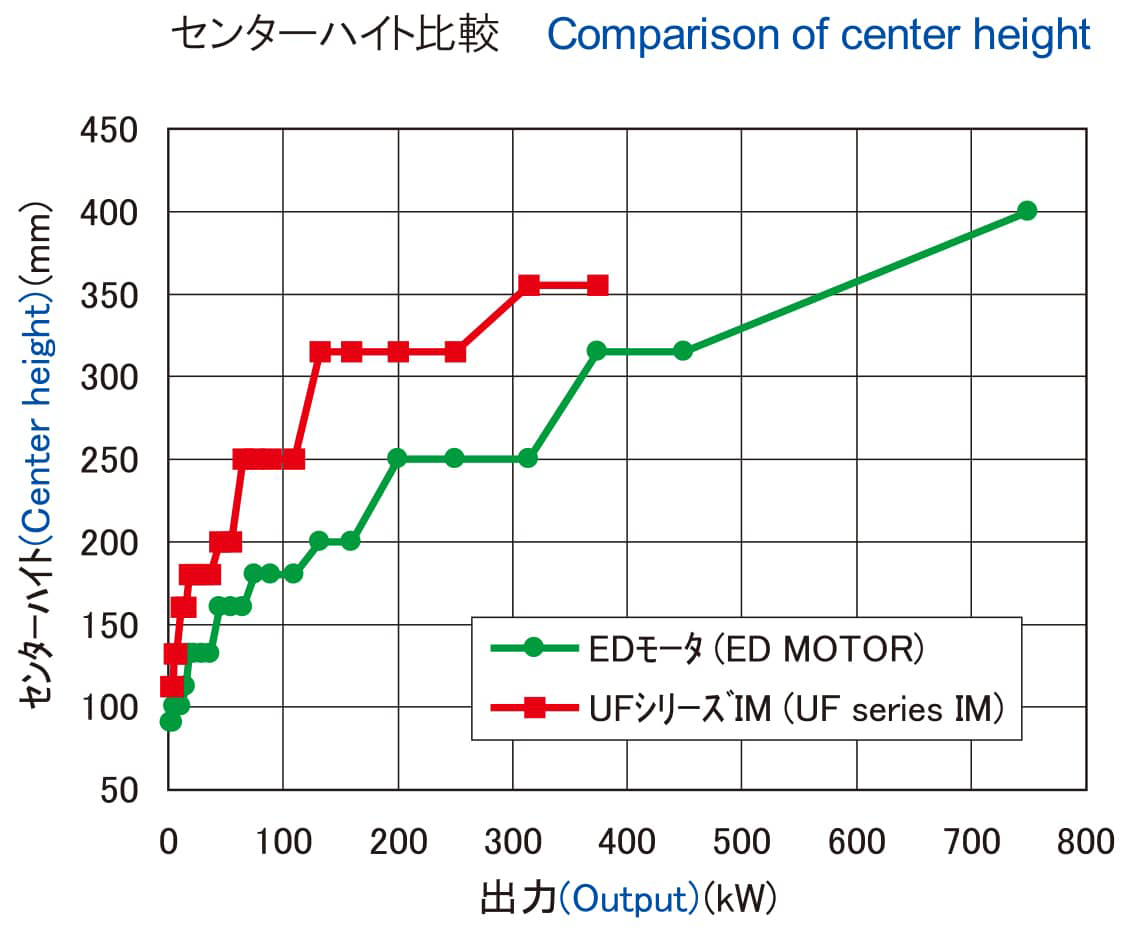 当社UFシリーズインバータ専用IMに対して、同一出力比較で センターハイトを2枠下げています。