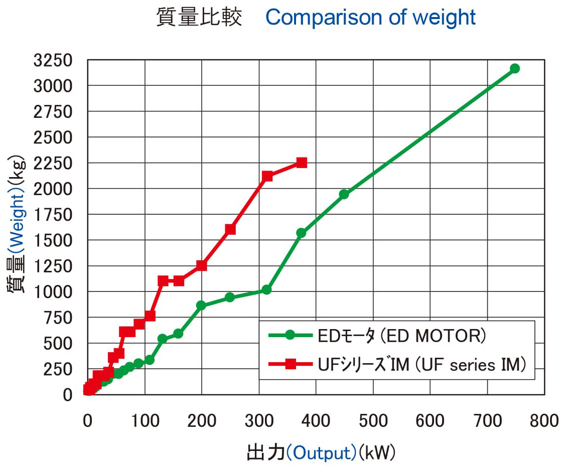 又、モータ質量も大幅に軽減されています。(当社UFシリーズインバータ専用IMに対して 32~57%軽減)