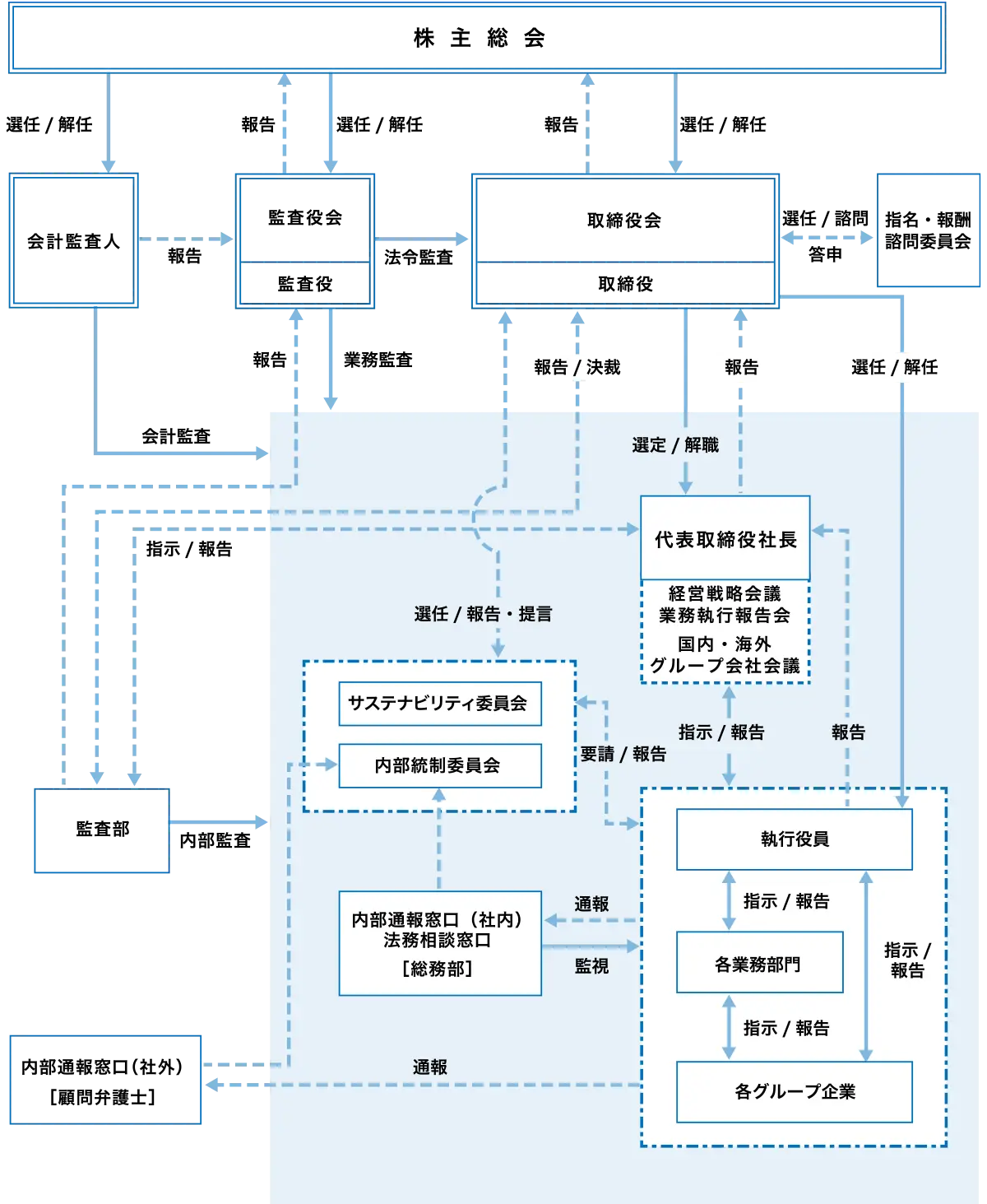 当社は、法令および定款に基づく会社の機関として、株主総会および取締役のほか、取締役会、監査役、監査役会および会計監査人を設置しています。また、コーポレート・ガバナンス強化のため、取締役会の監督機能と執行機能を分離し、取締役会は主にガバナンスを担い、業務執行は主に執行役員が担う体制としています。当社は、取締役会における監督機能に加え、監査役(会)による監査機能がともに有効に機能するよう努めており、現状の体制は十分に機能していると考えています。
