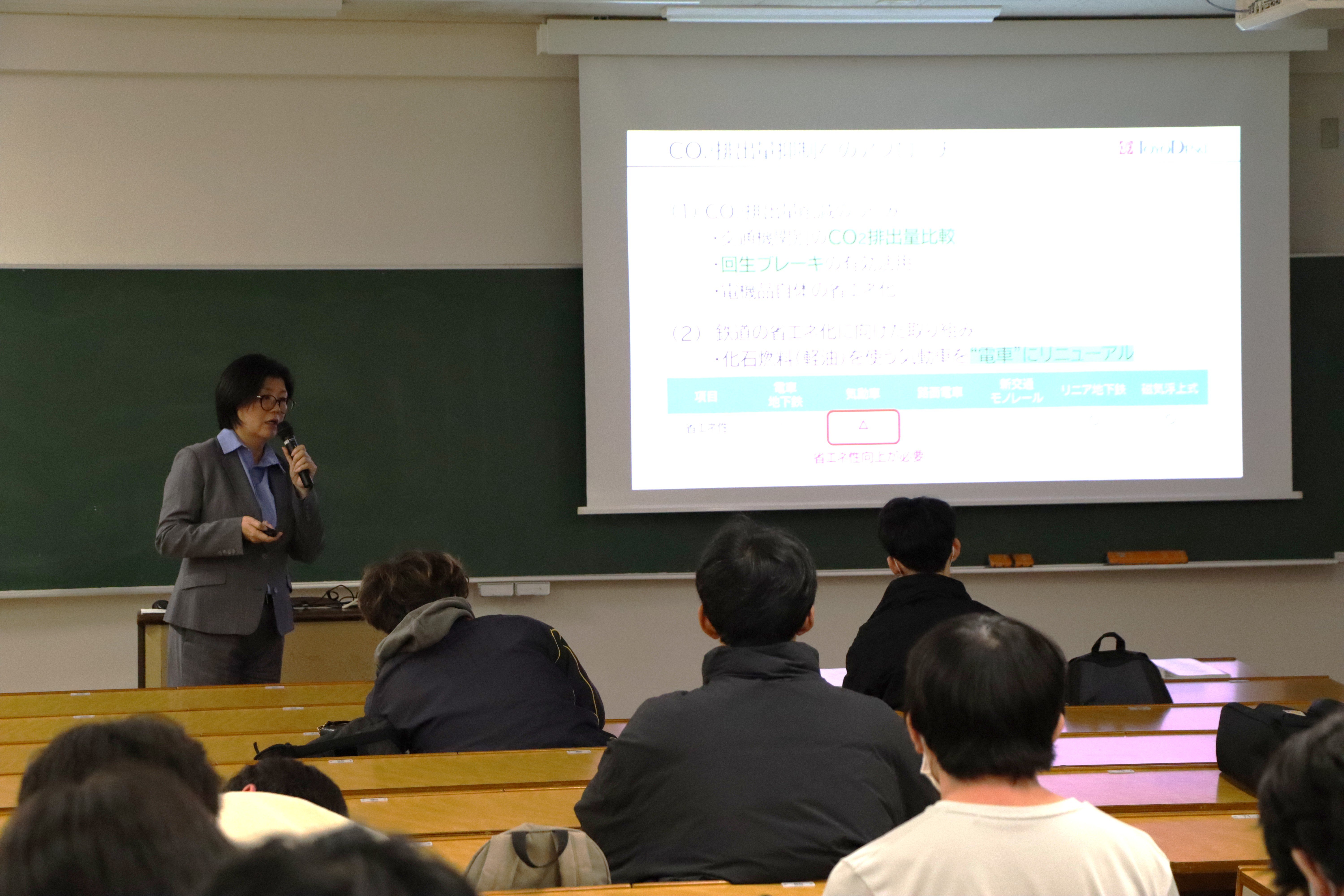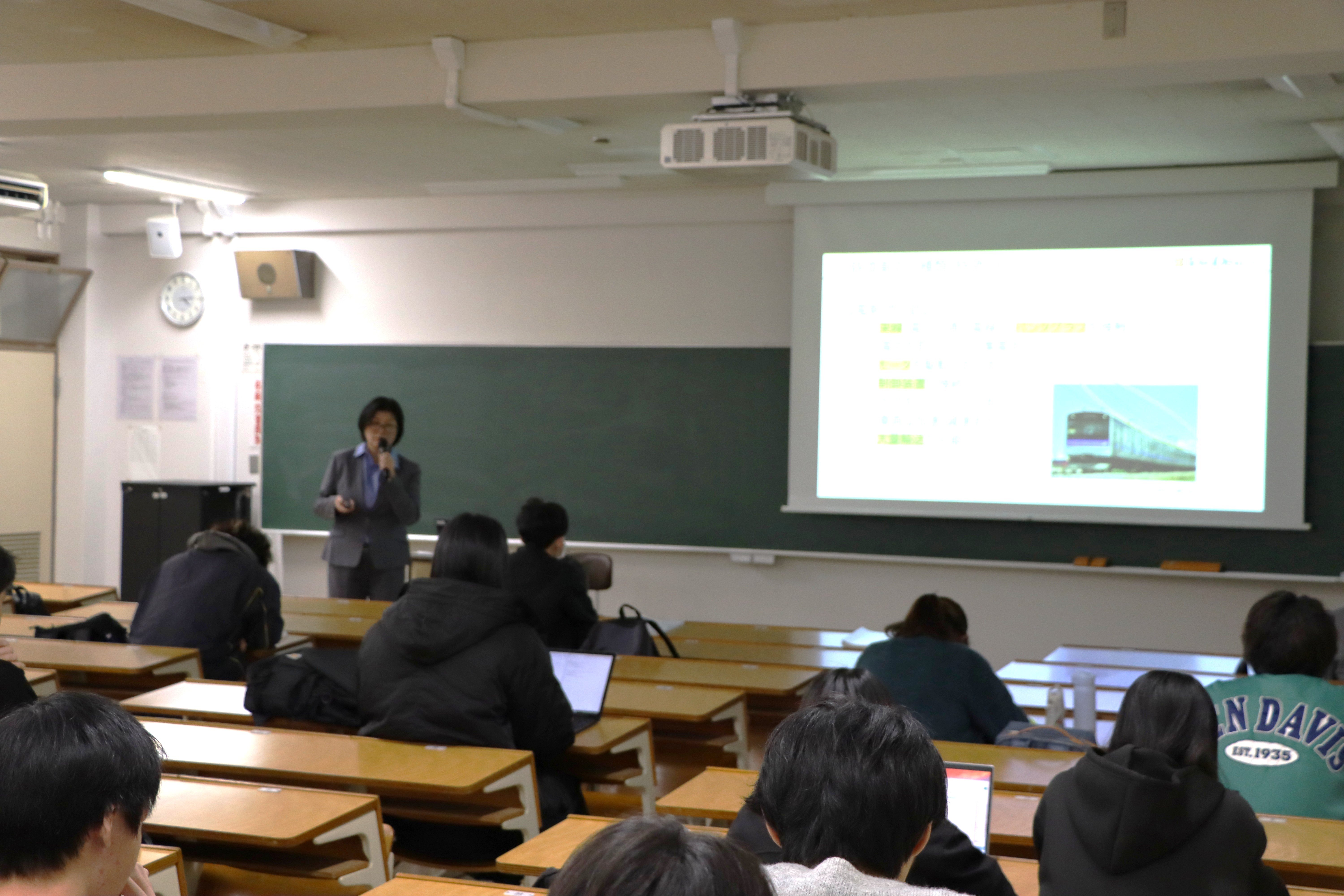 講義には理工学部や建築・環境学部などの学生45名が参加しました。当社社員が講師となり「当社のサステナビリティ経営・鉄道の環境優位性」と題して、当社が鉄道と社会の発展に貢献している役割、環境に配慮した乗り物として注目されている電車についての講義を行いました。