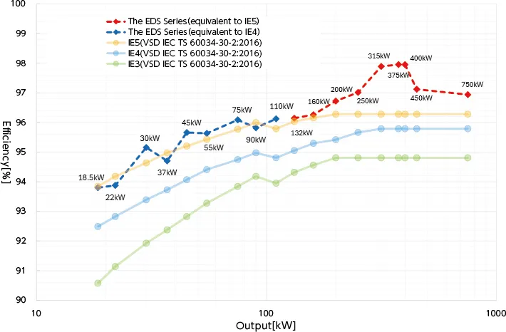 The EDS Series delivers high efficiency equivalent to IE4 (Super-Premium Efficiency) or above, while the EDU Series delivers high efficiency equivalent to IE5 (Ultra-Premium Efficiency) or above. High efficiency is maintained even in the partial load range, significantly reducing CO2 emissions and electricity consumption.