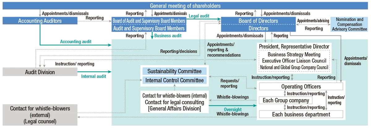 The Group's business activities are based on the business principles that "prioritize ethics and contribute to the prosperity of customers and society as a whole." We therefore strive to attain sound corporate management through strengthening and reinforcing corporate governance, while fully appreciating the significance of compliance based on corporate ethics. At the same time, we review as appropriate our management monitoring system to ensure its conformity to the changes in the business environment including social environment and relevant legislation.